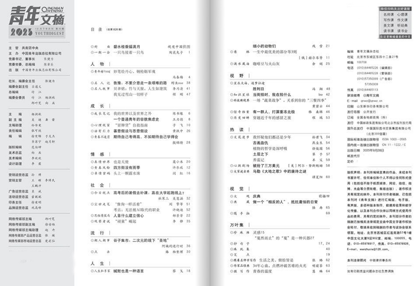 雜志的使命,不僅是傳遞信息,更是塑造人格、點(diǎn)燃理想。它相信,每一篇文章都可能成為一粒種子,在年輕人心中生根發(fā)芽;每一次閱讀,都可能是一次心靈的覺(jué)醒。在喧囂的時(shí)代里,它始終堅(jiān)守著對(duì)真善美的追求,為青春注入力量,為未來(lái)播種希望。這本承載著幾代人青春記憶的刊物,將繼續(xù)以文字為舟,以思想為帆,引領(lǐng)一代又一代青年,在人生的航程中,駛向更加遼闊的海洋。