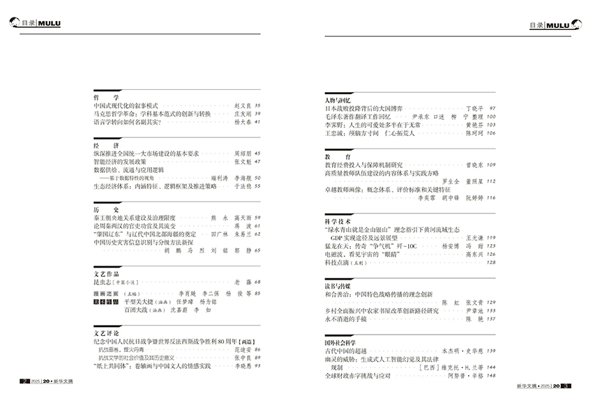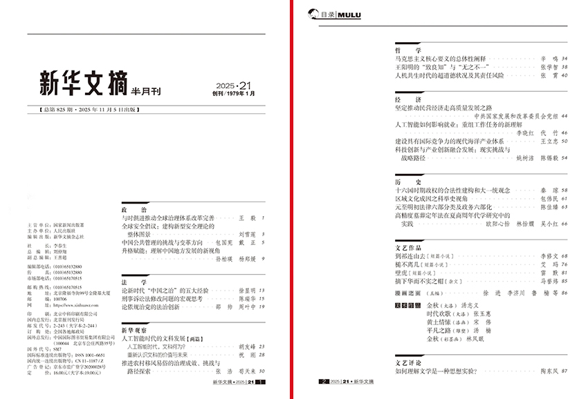 《新華文摘》雜志自創(chuàng)刊以來(lái),始終以“濃縮精華、服務(wù)學(xué)術(shù)、傳承文明”為宗旨,廣泛遴選哲學(xué)、社會(huì)科學(xué)、文學(xué)藝術(shù)等領(lǐng)域的優(yōu)秀成果,被譽(yù)為“學(xué)術(shù)界的風(fēng)向標(biāo)”。隨著中國(guó)社會(huì)科學(xué)體系的不斷完善和研究深度的持續(xù)拓展,單一學(xué)科的視角已難以應(yīng)對(duì)復(fù)雜的社會(huì)現(xiàn)實(shí),跨學(xué)科、多維度的研究范式逐漸成為主流。為適應(yīng)這一變化,改刊后的雜志由月刊調(diào)整為半月刊,不僅顯著加快了信息傳播的速度,更在時(shí)效性上實(shí)現(xiàn)了質(zhì)的飛躍。在知識(shí)更新日益加速的今天,能夠及時(shí)捕捉學(xué)術(shù)前沿動(dòng)態(tài),迅速呈現(xiàn)最新研究成果,使其成為學(xué)者、政策制定者和公眾了解學(xué)術(shù)動(dòng)向的重要窗口。 每期雜志保持16個(gè)欄目,這一科學(xué)合理的結(jié)構(gòu)設(shè)計(jì),既延續(xù)了刊物的綜合性傳統(tǒng),又增強(qiáng)了內(nèi)容的系統(tǒng)性與邏輯性。欄目涵蓋馬克思主義理論、哲學(xué)、經(jīng)濟(jì)學(xué)、政治學(xué)、法學(xué)、社會(huì)學(xué)、歷史學(xué)、文學(xué)、教育學(xué)、管理學(xué)等多個(gè)學(xué)科領(lǐng)域,同時(shí)設(shè)置“熱點(diǎn)聚焦”“前沿探討”“學(xué)術(shù)動(dòng)態(tài)”等專(zhuān)題性欄目,專(zhuān)門(mén)用于整合和呈現(xiàn)跨學(xué)科、交叉性的研究成果。這種靈活而富有彈性的欄目布局,有效解決了原有體系難以容納新興議題的問(wèn)題,為那些處于學(xué)科邊緣、卻具有重大現(xiàn)實(shí)意義的學(xué)術(shù)探索提供了展示平臺(tái)。