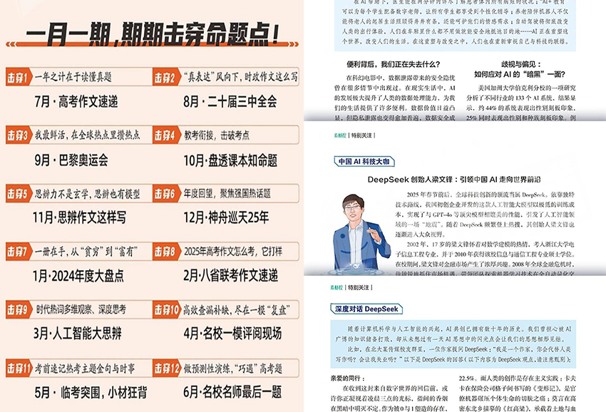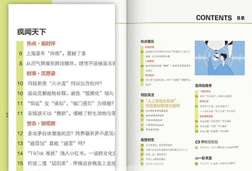《瘋狂作文》雜志的一大特色在于其“鮮活實(shí)用”的內(nèi)容設(shè)計(jì)。雜志拒絕空洞說教,注重將寫作理論轉(zhuǎn)化為具體可感的實(shí)踐方法。設(shè)有“名師講堂”“寫作兵法”“素材加油站”“同題異構(gòu)”“考場(chǎng)佳作”“升格之道”等精品欄目,既有寫作方法的系統(tǒng)講解,也有真實(shí)案例的對(duì)比分析;既有熱點(diǎn)話題的前瞻預(yù)測(cè),也有經(jīng)典素材的深度挖掘。特別是“素材加油站”欄目,圍繞社會(huì)熱點(diǎn)、傳統(tǒng)文化、科技發(fā)展、人文關(guān)懷等主題,整理歸納高價(jià)值寫作素材,并提供多種運(yùn)用角度,幫助學(xué)生解決“無米下鍋”的難題。