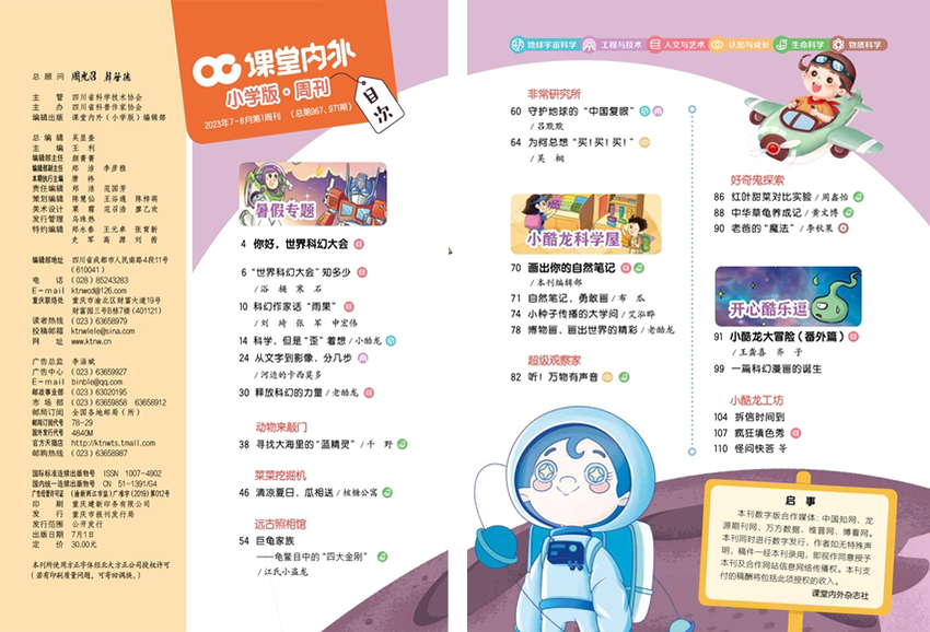 《課堂內(nèi)外》作為覆蓋全學(xué)段的青少年期刊群核心,旗下?lián)碛行W(xué)版、初中版、高中版及大學(xué)版四大主力刊號(hào),每月出版19種系列期刊,月發(fā)行量超220萬(wàn)冊(cè),是國(guó)內(nèi)發(fā)行量最大的優(yōu)秀青少年科普期刊之一,四十余年來(lái)始終堅(jiān)守“服務(wù)青少年成長(zhǎng)”的核心使命,構(gòu)建起從小學(xué)到大學(xué)的全鏈條教育內(nèi)容服務(wù)體系。 雜志以“銜接課堂內(nèi)外,貫通知識(shí)與成長(zhǎng)”為辦刊理念,形成了特色鮮明的內(nèi)容矩陣。小學(xué)版聚焦科學(xué)啟蒙與素養(yǎng)培育,通過(guò)趣味實(shí)驗(yàn)和故事化表達(dá)激發(fā)探索熱情;初中版?zhèn)戎貙W(xué)科拓展與青春期引導(dǎo),平衡知識(shí)深化與成長(zhǎng)困惑解答;高中版聚焦學(xué)業(yè)規(guī)劃與思維提升,緊扣升學(xué)需求與核心素養(yǎng)發(fā)展;大學(xué)版則銜接職業(yè)探索與社會(huì)認(rèn)知,搭建校園與職場(chǎng)的過(guò)渡橋梁。依托韓啟德院士擔(dān)任首席顧問(wèn),曹文軒、阿來(lái)等名家組成的顧問(wèn)團(tuán),以及2000余名一線教師特約編輯隊(duì)伍,雜志實(shí)現(xiàn)了專(zhuān)業(yè)性與可讀性的有機(jī)統(tǒng)一。