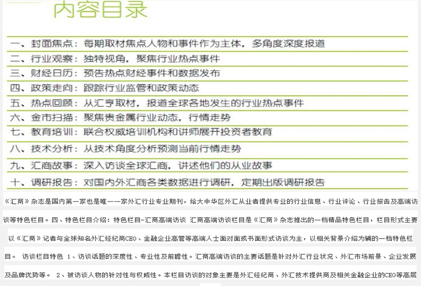 雜志內(nèi)容兼具新聞性與深度性,開設(shè)卷首語、封面焦點、行業(yè)觀察、政策走向、熱點回顧、金市掃描等核心欄目,多角度解讀業(yè)內(nèi)熱點事件。其“匯商高端訪談”特色欄目,聚焦全球知名外匯經(jīng)紀(jì)商CEO、金融企業(yè)高管等行業(yè)領(lǐng)軍者,圍繞市場前景、企業(yè)戰(zhàn)略等議題展開深度對話,兼具前瞻性與實操價值;政策解讀板塊聯(lián)合權(quán)威專家機構(gòu),及時分析監(jiān)管動態(tài)對行業(yè)的影響,為從業(yè)者提供合規(guī)指引。