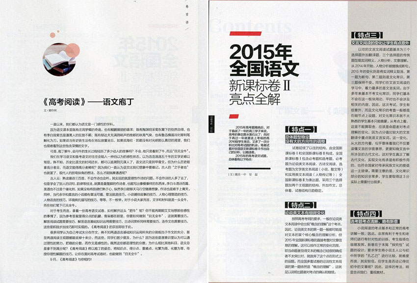 高考閱讀雜志》是一本深耕高考閱讀領(lǐng)域、專為高三考生量身打造的教輔期刊,自創(chuàng)辦以來始終以“精準(zhǔn)對(duì)接考綱、提升閱讀素養(yǎng)、助力高考提分”為核心使命,憑借專業(yè)性、實(shí)用性與創(chuàng)新性,成為眾多考生備考路上的“閱讀提分利器”。雜志由資深高考命題研究專家、一線語文特級(jí)教師及教育媒體人聯(lián)合編撰,內(nèi)容緊扣高考語文閱讀命題趨勢(shì),兼顧知識(shí)積累與能力提升,為考生構(gòu)建了科學(xué)高效的閱讀備考體系。