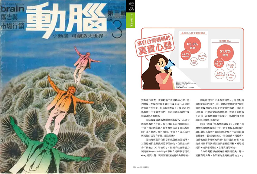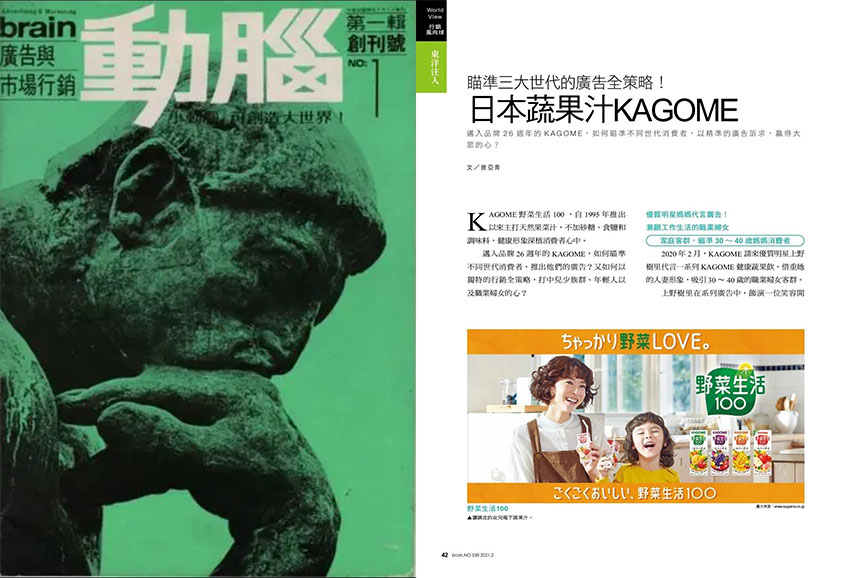 《動(dòng)腦雜志》是華文地區(qū)行銷創(chuàng)意領(lǐng)域的標(biāo)桿性專業(yè)刊物,由動(dòng)腦雜志社創(chuàng)辦于1977年,以“溝通創(chuàng)意、鼓勵(lì)創(chuàng)意精神,激發(fā)動(dòng)腦風(fēng)氣”為創(chuàng)刊宗旨,歷經(jīng)四十余年深耕,已成為行業(yè)不可或缺的交流與資訊平臺(tái)。雜志為月刊,16開全彩印刷,發(fā)行網(wǎng)絡(luò)覆蓋臺(tái)、港、新、馬及美國等地的華文廣告界,讀者涵蓋廣告公司從業(yè)者、企業(yè)行銷公關(guān)人員及創(chuàng)意愛好者。