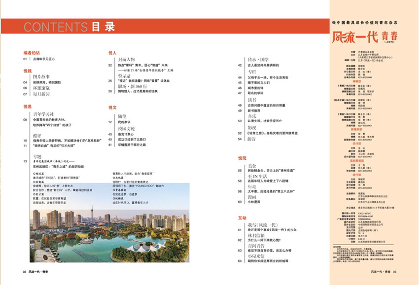 《風(fēng)流一代·青春》雜志被全國(guó)期刊協(xié)會(huì)確定為“全國(guó)百佳期刊閱覽室必有刊物”,近年來(lái),圍繞“分享不一樣的青春、追尋不一般的人生”辦刊理念,著力打造“中國(guó)具成長(zhǎng)價(jià)值的青年雜志”,品牌影響力在全國(guó)同類(lèi)期刊中名列前茅。
