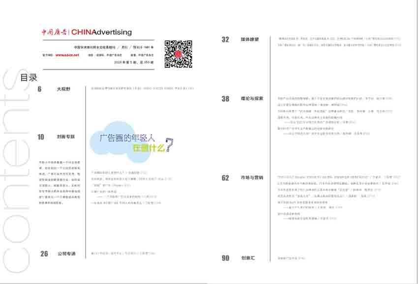 《中國廣告》是廣告學(xué)術(shù)性刊物。主要刊登對我國社會(huì)主義廣告研究和探討的文章,論述我國社會(huì)主義廣告的性質(zhì)、任務(wù)和作用,探討社會(huì)主義廣告學(xué)及其相關(guān)聯(lián)的學(xué)科群,交流我國廣告業(yè)務(wù)情況及成功的廣告事例,研究各類廣告的構(gòu)思、設(shè)計(jì)、制作、介紹國外及港澳地區(qū)的廣告動(dòng)態(tài)、國內(nèi)外優(yōu)秀廣告作品、廣告史料、資料等。