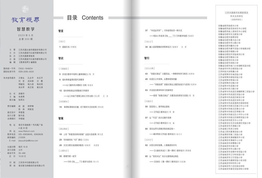 《教育視界》(月刊)經(jīng)過多年的不懈努力,流行度高,大眾辨識度廣,創(chuàng)刊于2015年,開拓了視野,帶給讀者富有生活特色的內(nèi)容。校長智囊團、教師思想庫,智慧教學版面向全國小學一線語文和數(shù)學教師,以分享教學智慧為辦刊核心追求。
