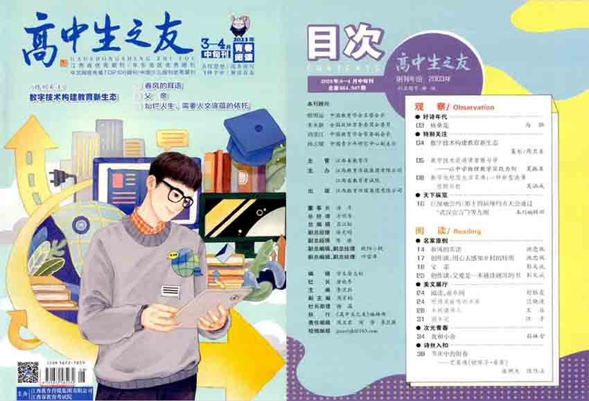 該雜志的主要內(nèi)容涵蓋了學(xué)科學(xué)習(xí)、文化藝術(shù)、科技交流、社會新聞、青少年心理健康等多個方面,特別注重高中生群體的學(xué)習(xí)和情感需求,秉承啟迪高中生眼界,提高高中生素質(zhì)的雜志宗旨,引導(dǎo)讀者積極地探究學(xué)科知識、把握時代潮流、關(guān)注國家重大治理議題、構(gòu)建自己的成長體系、增進(jìn)交流與理解,幫助高中生樹立正確的人生觀和價值觀,面向未來做好準(zhǔn)備。