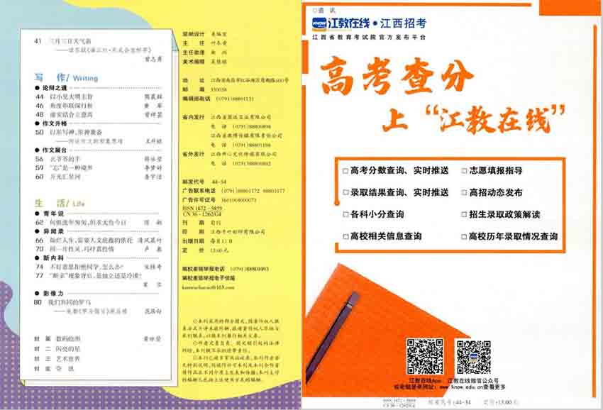 全年一共12期,旬刊,單期48頁,彩色銅版紙。出版單位:江西教育期刊社有限責(zé)任公司
