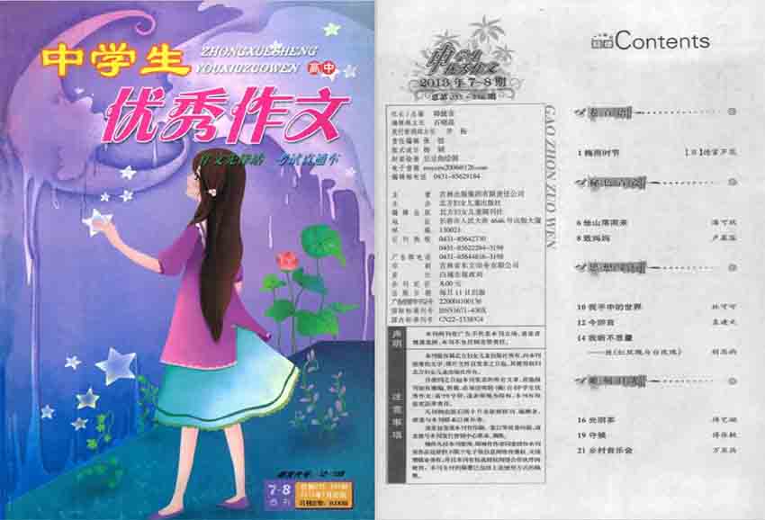 雜志的內(nèi)容主要包括:中學(xué)生優(yōu)秀作文、名師點(diǎn)評(píng)、作文指導(dǎo)、寫(xiě)作技巧、名篇鑒賞、名人作品、文學(xué)欣賞等方面的報(bào)道。該雜志通過(guò)推薦和展示中學(xué)生優(yōu)秀作文,為廣大中學(xué)生學(xué)習(xí)作文提供了借鑒、參考的范本,同時(shí)也為教育工作者提供了有效的教育資源。