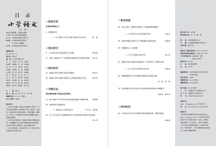 《小學語文》主要欄目:名家講堂、百年語文研究、實踐與反思、精品課堂、備課之窗、測試與評價、課外閱讀指導、教材解析、文本解讀、作家一席談、古詩詞鑒賞、港澳臺速遞、境外傳真、課改風景線、學會動態(tài)、讀書時間、語文人生。