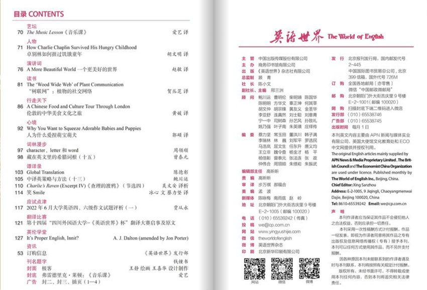 《英語世界》是一份專為英語學習愛好者、英語教育工作者和語言培訓機構設計的英語學習類雜志。它的目的是為英語愛好者提供一個學習英語的平臺,幫助讀者提高英語聽說讀寫的能力和文化素養(yǎng)。內容全面、有趣、實用,適合各個年齡段的英語學習者閱讀,這些豐富多樣的內容為英語學習者和教育工作者提供了大量優(yōu)質閱讀素材,幫助他們提高英語水平和跨文化交流能力。