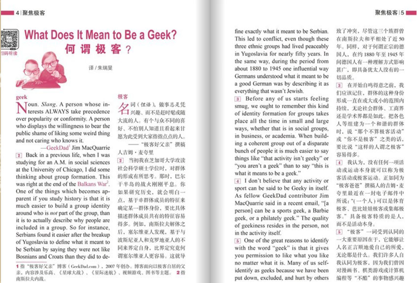 選擇優(yōu)秀的英語小說、詩歌和短篇文章,幫助讀者提高閱讀的能力和英文表達的能力。介紹英語世界中有影響力的學術類及一般圖書,讓讀者了解最新熱門的英語書籍。該雜志還有分類廣告欄、讀者來信、英語語言學習技巧、英語演講和演畫等欄目。