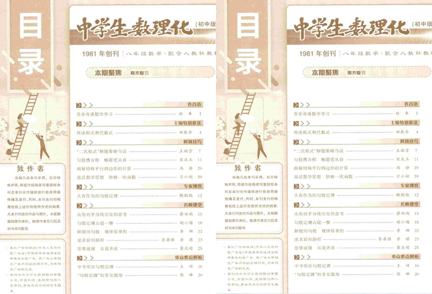 主要內(nèi)容包括教育科普、學(xué)科知識(shí)、考試技巧和名校介紹。雜志面向中學(xué)生,以科普教育為主,旨在傳播數(shù)學(xué)、物理和化學(xué)學(xué)科知識(shí),幫助讀者更好地學(xué)習(xí)、掌握科技知識(shí),了解當(dāng)下的科學(xué)發(fā)展?fàn)顩r,養(yǎng)成科學(xué)精神和探究興趣,提高他們?cè)谥袑W(xué)時(shí)期的綜合素質(zhì)和競爭力。