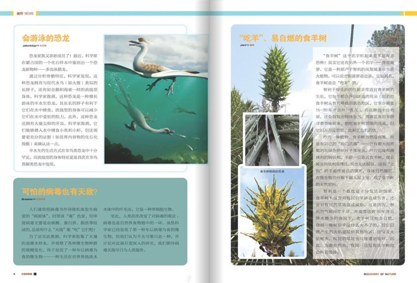 《大自然探索》(月刊)經(jīng)過多年的不懈努力,流行度高,大眾辨識(shí)度廣,創(chuàng)刊于1982年,開拓了視野,帶給讀者富有生活特色的內(nèi)容?!洞笞匀惶剿鳌方沂咀匀粖W秘,再現(xiàn)探索歷程、適讀人群:初中學(xué)生、高中學(xué)生、自然科技愛好者、12-15歲初中生、15-18歲高中生等等?!洞笞匀惶剿鳌烦浞仲N合了少年兒童的生理和心理需求,用圖文并茂、淺顯易懂的方式,把科學(xué)家們對(duì)世界、對(duì)科學(xué)的艱難探索歷程講述出來,把人與自然彼此依存、休戚相關(guān)的關(guān)系詮釋出來,以此來肥沃有利于少年兒童成長(zhǎng)的科學(xué)土壤,培養(yǎng)少年兒童從小學(xué)科學(xué)、愛科學(xué)、用科學(xué)、創(chuàng)新科學(xué)的科學(xué)思維和科學(xué)精神。