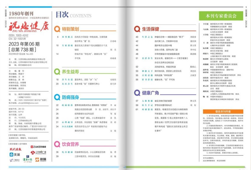 《祝您健康》主要欄目:健康真情、本刊綜述、養(yǎng)生之道、心靈深處、心理疏導門診、女性保健、讀者熱線。