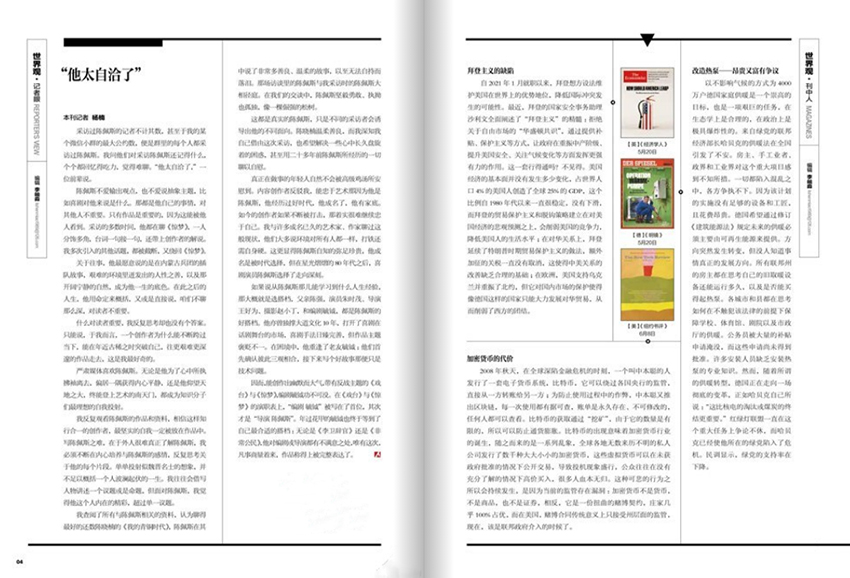 總之,《南方人物周刊》是一本具有深度和影響力的人物類(lèi)雜志,以獨(dú)特的視角呈現(xiàn)各種人物故事,關(guān)注中國(guó)各地社會(huì)斑斕多彩的側(cè)面,記錄各行各業(yè)中的普通人和異數(shù)人的生活故事。該雜志有廣泛而深入的社會(huì)背景和歷史文化背景,對(duì)于記錄中國(guó)社會(huì)和文化的發(fā)展有著重要的作用。它注重新聞報(bào)道、調(diào)查報(bào)道、人物故事和文化評(píng)論,提供給讀者豐富多彩的深度閱讀體驗(yàn)。