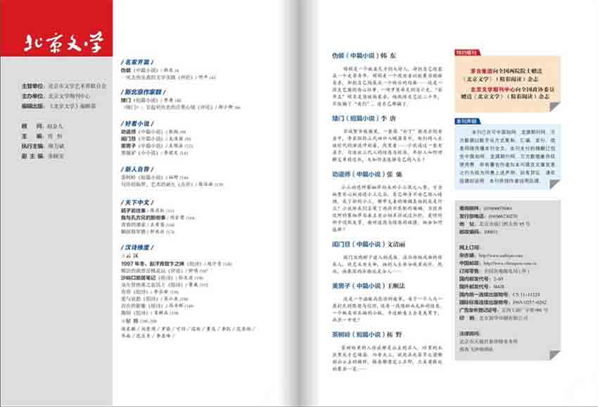 《北京文學(xué)》是中國(guó)具有重要影響力的文學(xué)刊物之一。雜志以北京文學(xué)創(chuàng)作為主要內(nèi)容,涵蓋了北京文藝事業(yè)的發(fā)展歷程,展現(xiàn)了北京地區(qū)文學(xué)創(chuàng)作和文化創(chuàng)意的成果,是反映中國(guó)文學(xué)發(fā)展?fàn)顩r的重要見(jiàn)證和載體該雜志每期發(fā)行均會(huì)認(rèn)真選擇一些涵蓋小說(shuō)、散文、詩(shī)歌、文藝?yán)碚?、文化評(píng)論和創(chuàng)作策劃等內(nèi)容的原創(chuàng)作品,注重傳承和弘揚(yáng)中國(guó)傳統(tǒng)文化,同時(shí)注重探索和發(fā)現(xiàn)新的文學(xué)創(chuàng)作方式。其作品既有歷史沉淀的經(jīng)典作品,也有新近創(chuàng)作的優(yōu)秀文學(xué)作品。雜志編輯重視文學(xué)創(chuàng)作的科學(xué)性、真實(shí)性、時(shí)代性,強(qiáng)調(diào)作品的思想性和創(chuàng)造性。