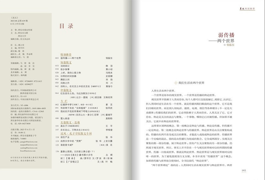 美文雜志是一個充滿靈性和思想深度的文學(xué)類雜志,還注重向讀者傳播健康、積極的生活哲學(xué),弘揚(yáng)文化藝術(shù)的積極價值觀。該雜志旨在通過文學(xué)作品向讀者傳遞正能量,啟發(fā)讀者思考人生。這些經(jīng)典的文學(xué)作品會深刻地影響讀者的思想和情感,成為讀者內(nèi)心成長不可或缺的一部分。