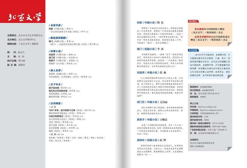 全年一共12期,月刊,單期208頁,彩色銅版紙。出版單位:北京文學月刊社