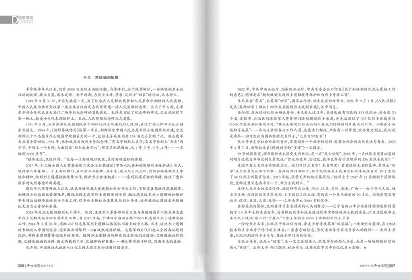“山河已無恙,英雄可歸家?!睆?014年起,我國已迎回9批共913位在韓中國人民志愿軍烈士遺骸,讓長眠異國他鄉(xiāng)的英雄兒女回歸闊別多年的祖國?!皣液腿嗣裼肋h(yuǎn)尊崇、銘記英雄烈士為國家、人民和民族作出的犧牲和貢獻。”這是英雄烈士保護法的莊嚴(yán)宣告。曾參加抗美援朝戰(zhàn)爭的老戰(zhàn)士涂伯毅表示:“我有許多戰(zhàn)友在戰(zhàn)場上失蹤,杳無音信,不少烈士的親屬一直不知道烈士安葬在何處。如今,黨和國家用行動告慰和守護英烈,我們也為老戰(zhàn)友感到欣慰。