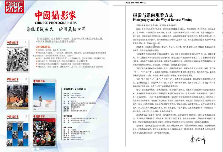 《中國攝影家》主要欄目:攝影器材、攝影藝術(shù)、國際交流、廣告攝影、專題討論、市場信息、專家論壇、讀者園地。